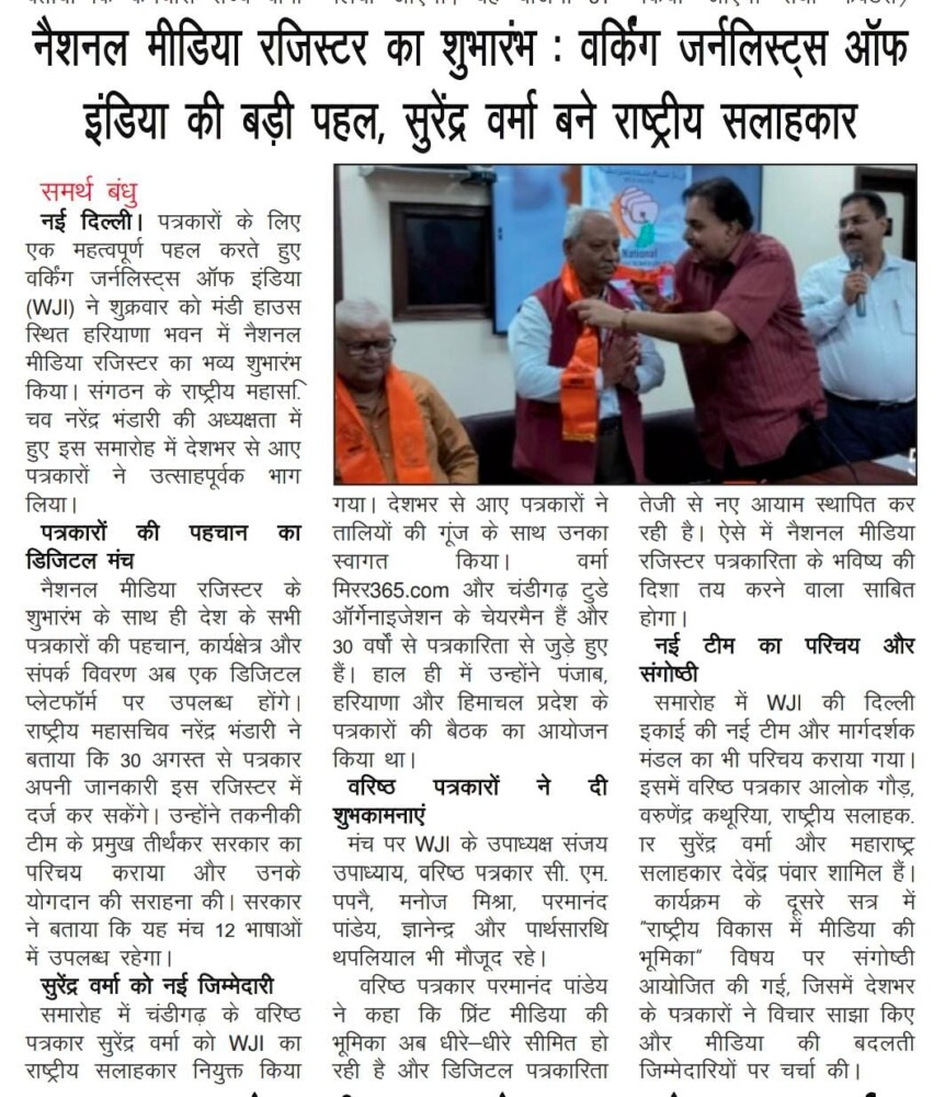 चंडीगढ़ से आए सुरेंद्र वर्मा को वर्किंग जर्नलिस्ट ऑफ इंडिया का राष्ट्रीय सलाहकार नियुक्त किया गया प्रोग्राम में आए हुए देश भर के पत्रकारों ने तालिया की गूंज के साथ उनका स्वागत किया। श्री सुरेन्द्र वर्मा मिरर 365.com और चंडीगढ़ टुडे ऑर्गेनाइजेशन वेब पोर्टल और यूट्यूब के चेयरमैन हैं और 30 साल से पत्रकारिता के क्षेत्र में काम कर रहे हैं। हाल ही में उन्होंने चंडीगढ़, पंजाब और हिमाचल प्रदेश के पत्रकारों की मीटिंग करवाई थी।