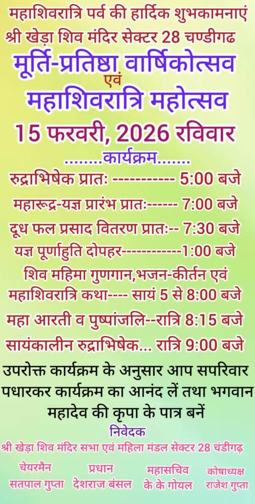 Chandigarh Tricity चण्डीगढ़ : श्री खेड़ा शिव मंदिर, सेक्टर 28 में मूर्ति-प्रतिष्ठा वार्षिकोत्सव एवं...