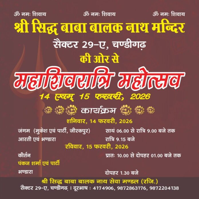 श्री सिद्ध बाबा बालक नाथ मन्दिर, सैक्टर 29-ए की ओर से दो दिवसीय महाशिवरात्रि महोत्सव 14 एवं 15 फरवरी को मनाया जाएगा जिसमें पहले दिन जंगम (मुकेश एवं पार्टी, जीरकपुर) सायं 06 से रात्रि 9 बजे तक अपने अनूठे अंदाज में शिव स्तुति प्रस्तुत करेंगे तथा रात्रि 9.15 बजे आरती एवं भण्डारा बरताया जाएगा। दूसरे दिन रविवार, 15 फरवरी को पंकज शर्मा एवं पार्टी द्वारा प्रातः 10.00 से दोपहर 01.00 बजे तक कीर्तन किया जाएगा तथा भण्डारा दोपहर 1.30 बजे से होगाप्रातः 10.00 से दोपहर 01.00 बजे तक होगा। ये जानकारी श्री सिद्ध बाबा बालक नाथ सेवा मण्डल के पदाधिकारियों ने दी।