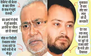 माना जा रहा है कि उपमुख्यमंत्री ने अपने ऊपर लगे आरोपों के मामले में मुख्यमंत्री को अपनी सफाई दी है. सीएम से मुलाकात के बाद उपमुख्यमंत्री राजद कोटे के सारे मंत्रियों के साथ अपने आवास पहुंचे, जहां सबने राजद अध्यक्ष लालू प्रसाद को मुलाकात का ब्योरा दिया. देर रात तक लालू प्रसाद के सरकारी आवास पर राजद कोटे के मंत्री और विधायक जुटे रहे. इस दौरान पार्टी के वरिष्ठ नेता भी पहुंचे. सूत्रों के मुताबिक राजद में आगे की रणनीति पर विचार हुआ.  कैबिनेट की बैठक शाम छह बजे शुरू हुई. करीब घंटे भर चली बैठक के बाद मुख्यमंत्री अपने कक्ष में आ गये. पांच मिनट बाद उपमुख्यमंत्री तेजस्वी प्रसाद यादव भी उनके कक्ष में पहुंचे. उनके साथ वित्त मंत्री अब्दुल बारी सिद्दीकी, स्वास्थ्य मंत्री तेजप्रताप यादव, शिक्षा मंत्री और प्रदेश कांग्रेस अध्यक्ष  डाॅ अशोक चौधरी समेत राजद कोटे के सभी मंत्री शामिल भी थे.
