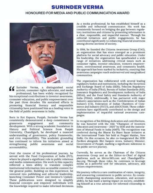 Surinder Verma, a distinguished social activist, consumer rights advocate, and media professional, has been widely recognized for his exceptional contributions to investor awareness, consumer education, and public empowerment over the past three decades. His sustained efforts in promoting financial literacy and responsible citizenship have positioned him as a leading voice in the field of public awareness in India.